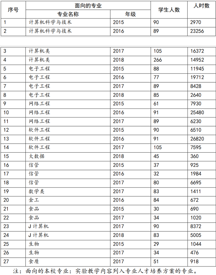 示范中心支撑计算机科学与技术、软件工程、网络工程及电子信息工程、数据科学与大数据等5个工科本科专业和计算机应用技术、软件理论两个研究生专业,2018年在校生1500余人。