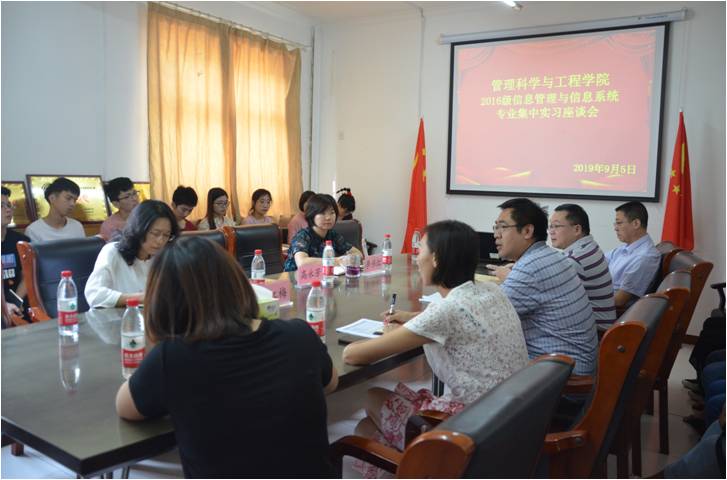 2019年9月5日,管理科学与工程公司2016级信息管理与信息系统专业集中实习座谈会在第三办公楼134会议室召开,参加此次会议的有公司党委书记高永芳、经理祁红梅、副经理李伟红、信息管理与信息系统系主任成岳鹏、辅导员李淑菊、专业指导老师以及16级信管专业员工。