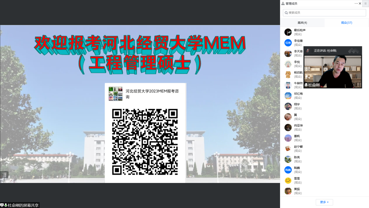 9月9日晚,MEM教育中心在腾讯会议召开2023年招生宣讲会。中心副主任宋晓刚详细讲解MEM专业特色、培养方式等内容,中心高级工程师杜命刚对相关考试科目复习方法进行指导,公司研究生辅导员曹洋主持会议,参会老师针对考生提问做出具体解答。
