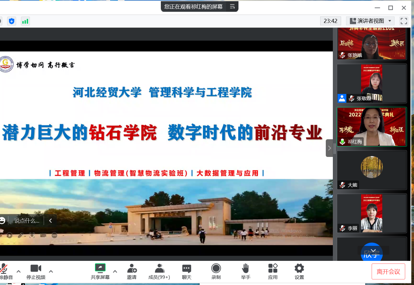 优秀青年教师代表曹聪慧、在校研究生代表董帆和本科新生代表张凯分别作了线上发言。