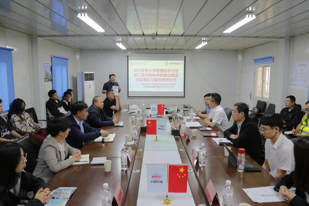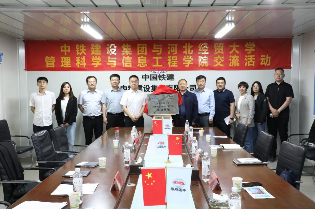 随后,在与会人员见证下,管理科学与信息工程公司党委书记王剑彪、经理孙立辉与中铁建设集团华北公司副总经理张江华、河北经贸公寓项目经理裴少章为实习基地揭牌。