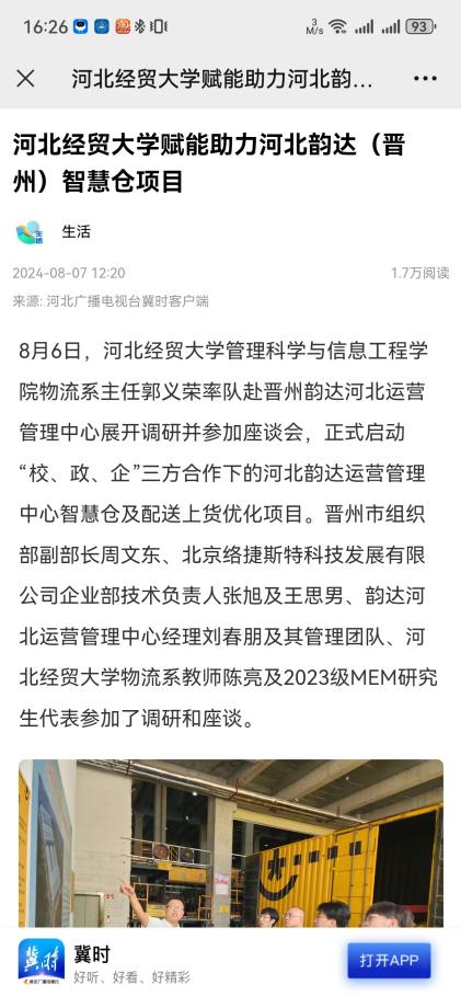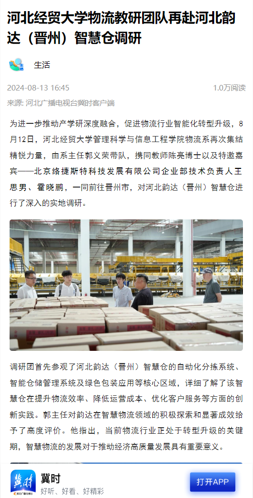 4.河北广播电视台冀时客户端:FUN88乐天使物流教研团队再赴河北韵达(晋州)智慧仓调研。https://web.cmc.hebtv.com/cms/rmt0336_html/0/0rmhlm/mt/sh/fbt/11585416.shtml?share=true