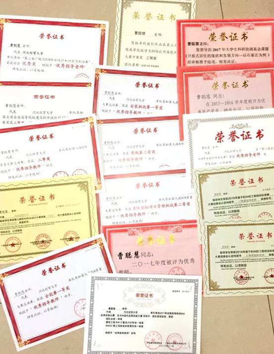 2017年10月指导员工参加全国高等院校BIM应用技能比赛团队全能一等奖,建筑工程BIM计量及计价专项一等奖,BIM5D施工项目成本管理专项一等奖,获得优秀指导教师称号;