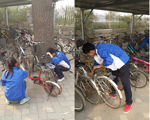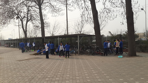 同学们在热情高涨的擦洗自行车,打扫附中校园卫生
