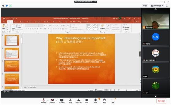 2021年4月1日,应公司和科研处邀请,美国德克萨斯大学吴思斌教授通过线上形式作了题为“追求趣味性:建立文章理论的技巧”的学术报告。报告由祁红梅经理主持,公司教师以及研究生等共100余人聆听了此次讲座。