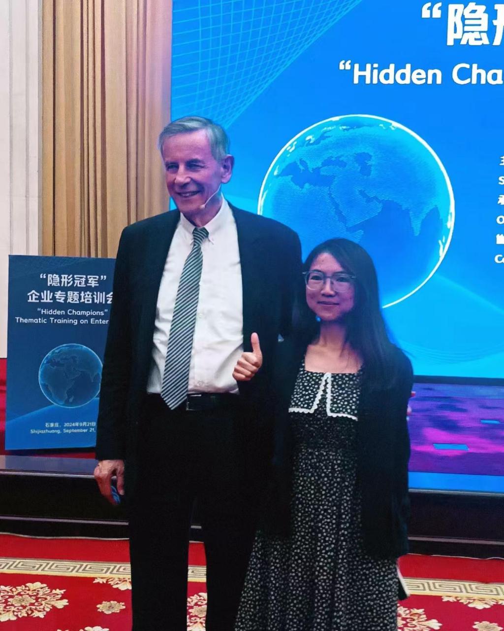 9月21日下午,由河北省科技厅主办的世界知名学者学术演讲会暨全球“隐形冠军”之父——赫尔曼·西蒙教授的企业专题培训会在太行国宾馆一楼柏坡厅举行。公司2023级MEM全日制研究生王乐、2024级MEM全日制研究生梁逸潇参加会议并就自己参研的河北中小企业科技特派员项目向赫尔曼·西蒙教授提问。